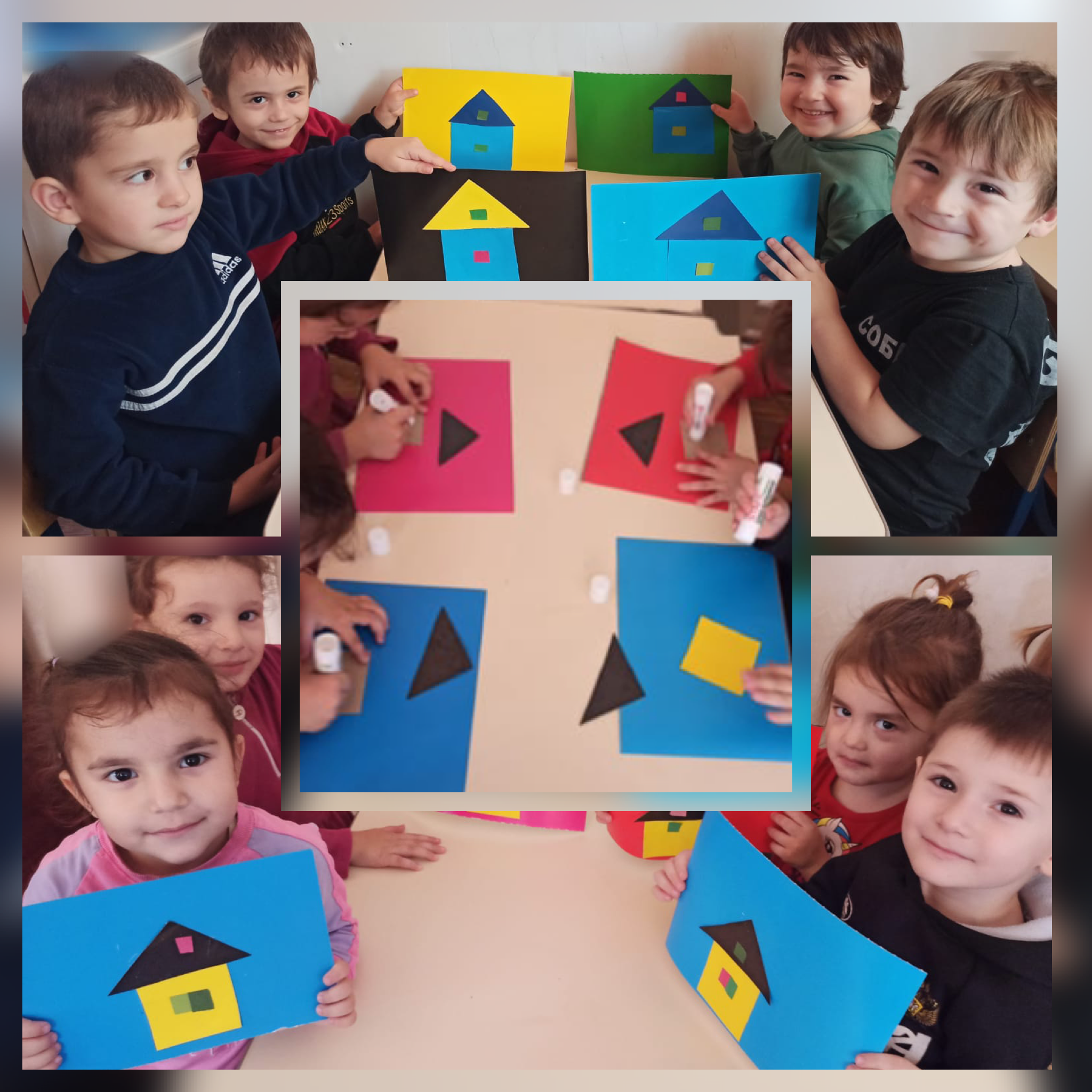 Каждый ребенок проявил не только смекалку, но свой вкус, выбрав предметы такого цвета, который им понравился. У каждого дома то количество окон, которое выбрал ребенок. Поэтому аппликация оказалась разнообразной.